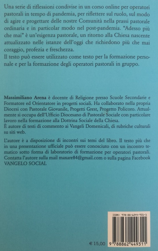 Massimiliano Arena, docente di Religione, scrittore, formatore, blogger, curatore su YouTube della rubrica quotidiana “Vangelo Social” (commento ai brani del Vangelo del giorno) responsabile della Pastorale Sociale per la Diocesi Vieste-Manfredonia-San Giovanni Rotondo ed appassionato divulgatore della Sacra Scrittura di cui da sempre è innamorato, intitola il suo terzo libro proprio in questo modo: “Adesso più che mai”.